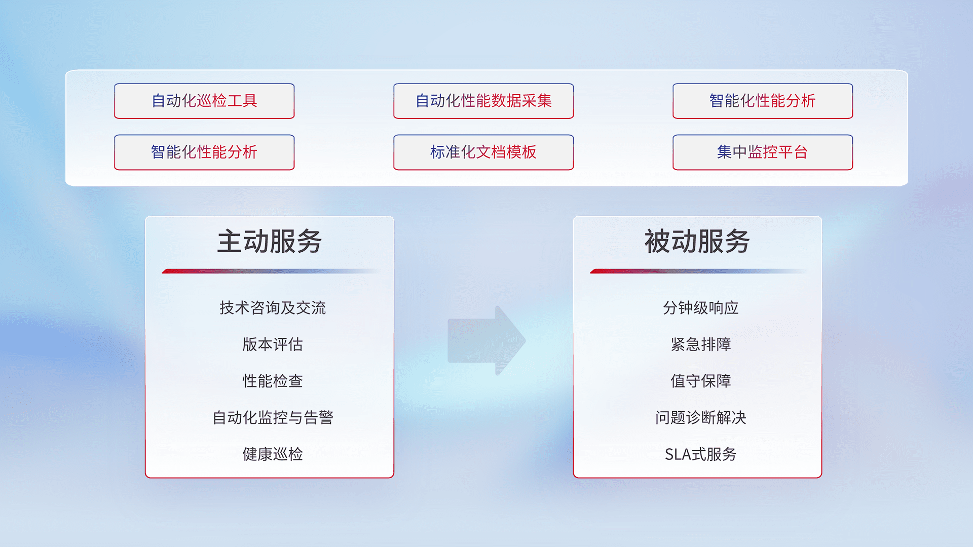 智能化工具和标准化文档,,保障服务质量,,,,提供主动服务(包含技术咨询、、、、版本评估、、、性能检查、、、、自动化监控与告警、、健康巡检)和被动服务包含(分钟级响应、、、、紧急排障、、、值守保障、、、问题诊断解决、、、SLA服务)。。。。